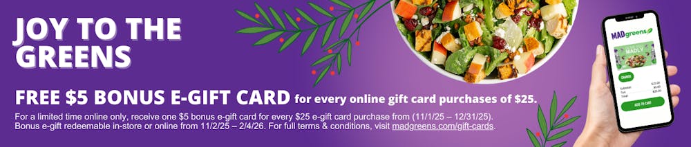 *2025 Holiday Gift Card Promotion Terms & Conditions: During the Distribution Period (11/1/25 – 12/31/25), receive one e-gift promotional certificate worth $5 for every $25 spent on an e-gift card. The promotional certificate is valid for redemption in-store or online at madgreens.com or MAD Rewards app from 11/2/25 – 2/4/26. Cannot be redeemed on the day of gift card purchase. Void where prohibited by law. No cash value. For promotional purposes only. Promotional certificate is not valid towards gift card purchases, catering, or third-party ordering sites. Valid at participating restaurants only (excludes airports). No stored value. Promotional certificate may be redeemed one (1) time and must be surrendered in-store at time of redemption. Excludes tax and gratuity. Cannot be duplicated, reprinted, or combined with any other offer, discount, or promotion. Enjoy!